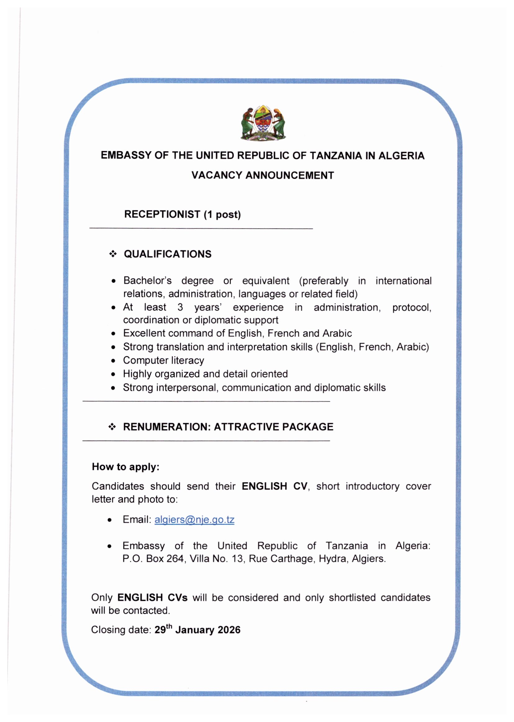 VACANCY ANNOUNCEMENT